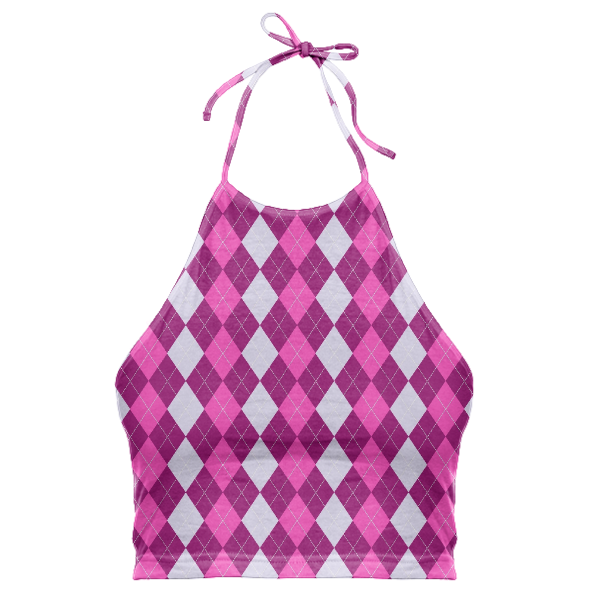 High neck halter top with adjustable ties. The back falls at the mid back and crops above the waist.