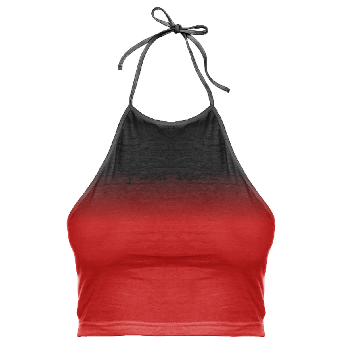 High neck halter top with adjustable ties. The back falls at the mid back and crops above the waist.