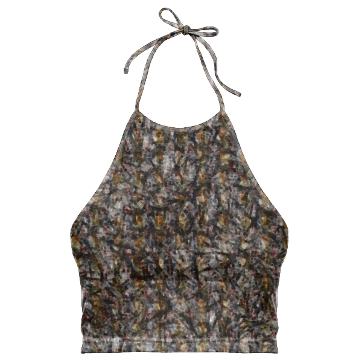 High neck halter top with adjustable ties. The back falls at the mid back and crops above the waist.