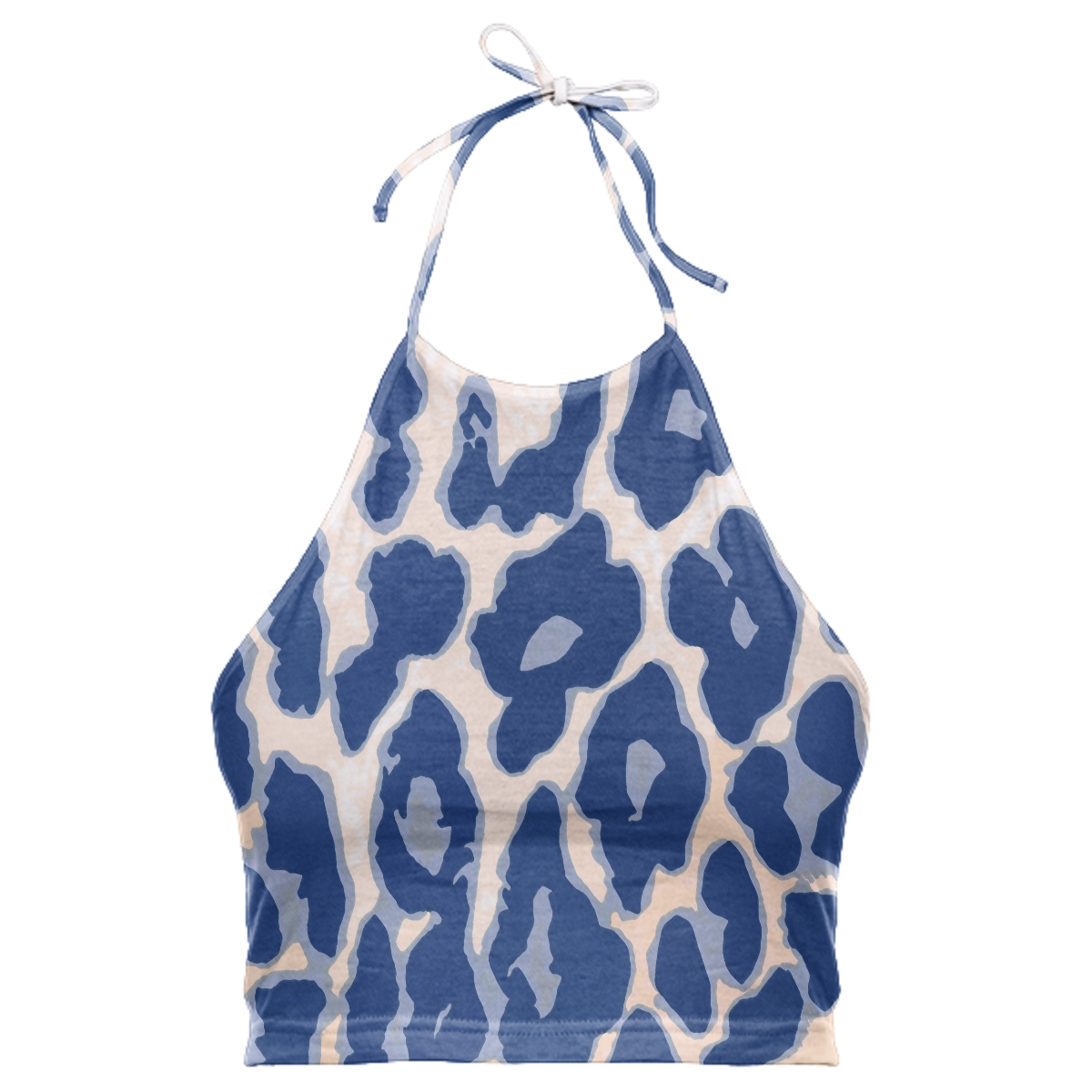 High neck halter top with adjustable ties. The back falls at the mid back and crops above the waist.