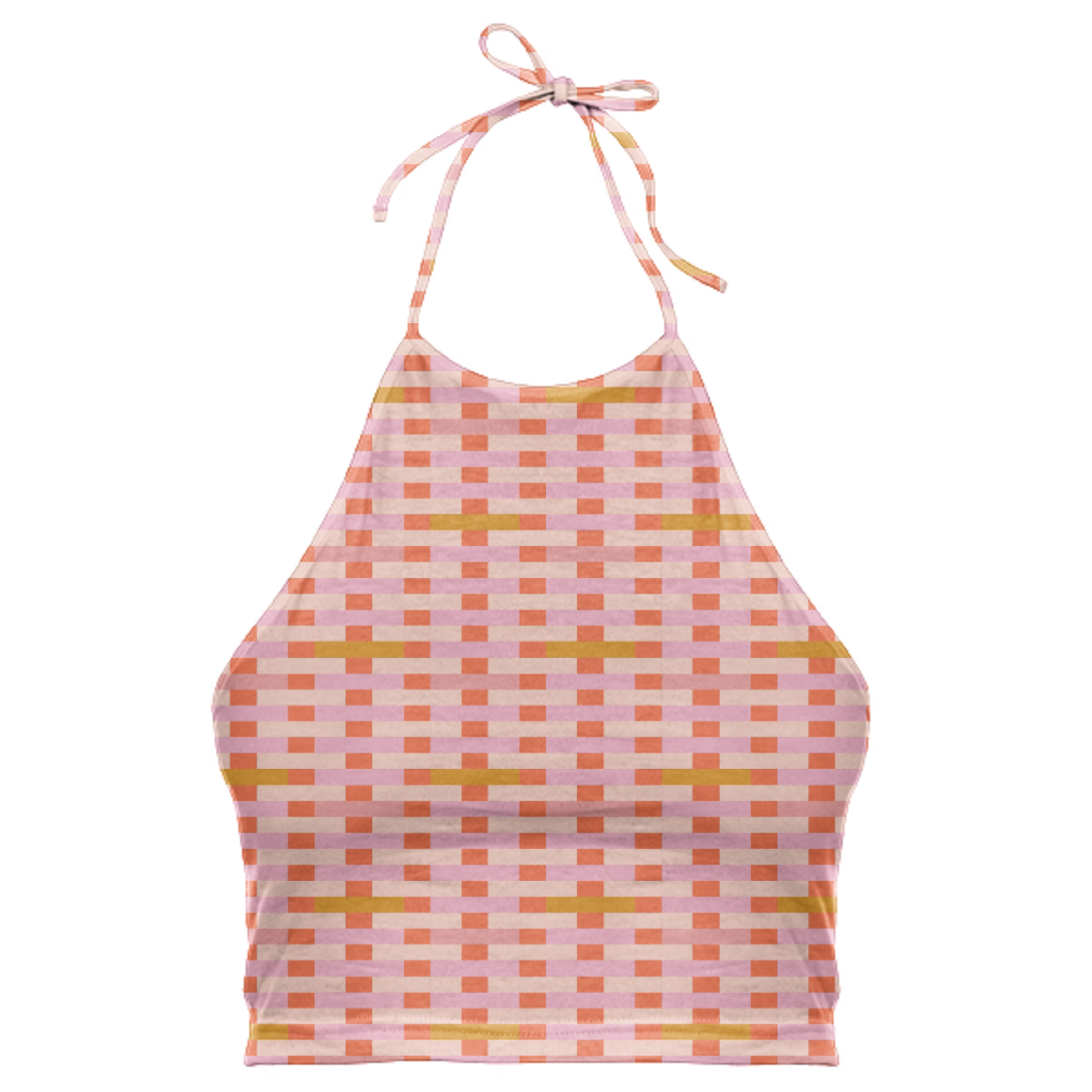 High neck halter top with adjustable ties. The back falls at the mid back and crops above the waist.