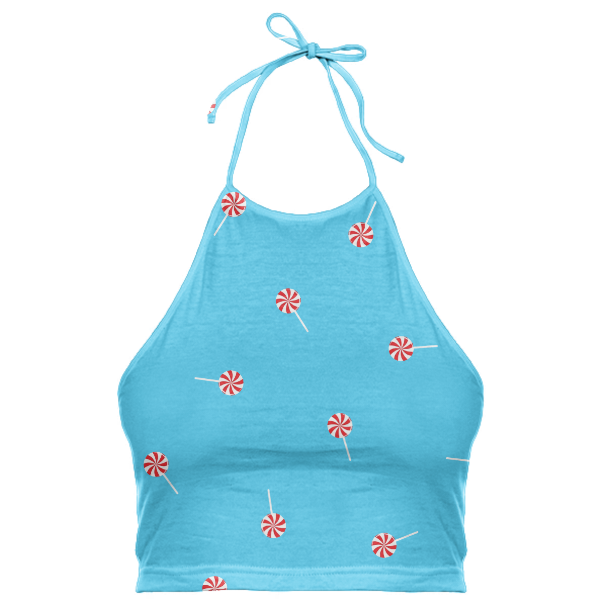 High neck halter top with adjustable ties. The back falls at the mid back and crops above the waist.