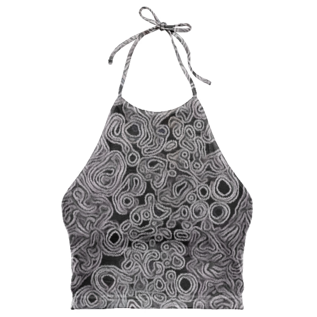 High neck halter top with adjustable ties. The back falls at the mid back and crops above the waist.