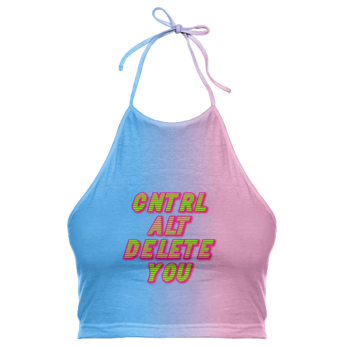 High neck halter top with adjustable ties. The back falls at the mid back and crops above the waist.