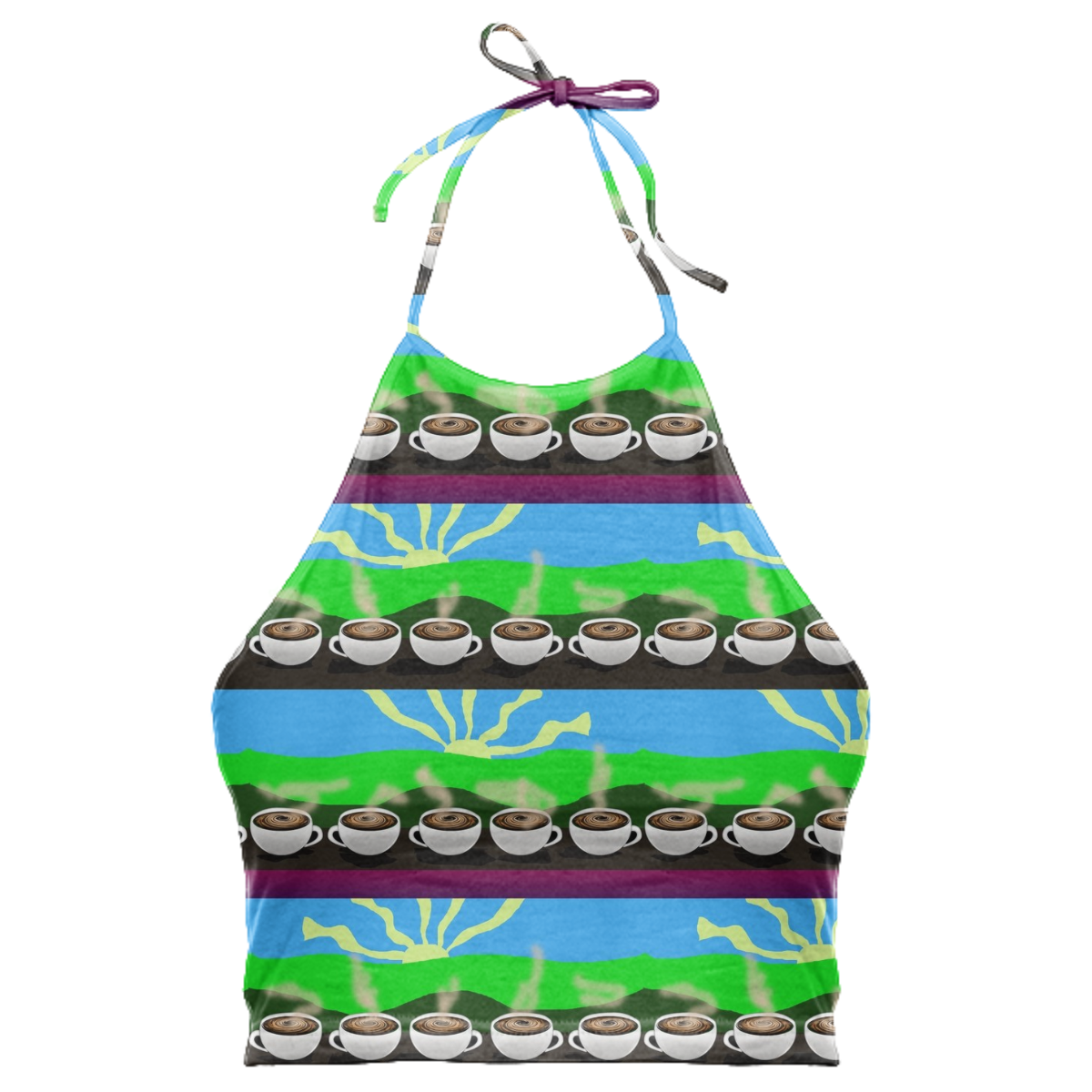 High neck halter top with adjustable ties. The back falls at the mid back and crops above the waist.