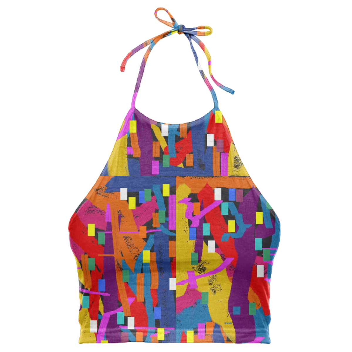 High neck halter top with adjustable ties. The back falls at the mid back and crops above the waist.