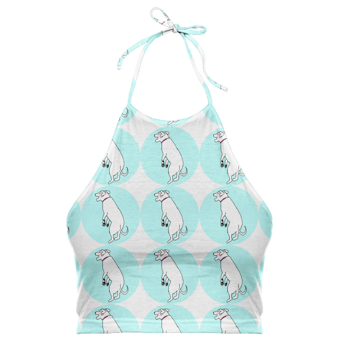 High neck halter top with adjustable ties. The back falls at the mid back and crops above the waist.