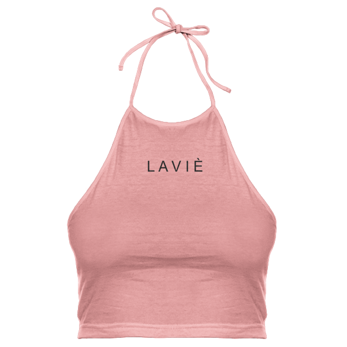 High neck halter top with adjustable ties. The back falls at the mid back and crops above the waist.