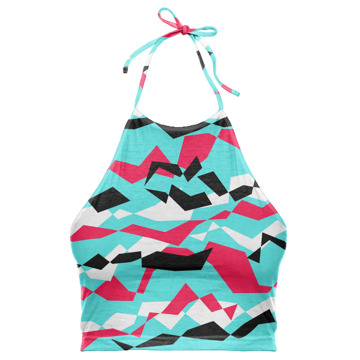 High neck halter top with adjustable ties. The back falls at the mid back and crops above the waist.