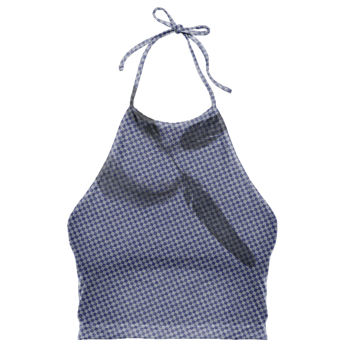 High neck halter top with adjustable ties. The back falls at the mid back and crops above the waist.