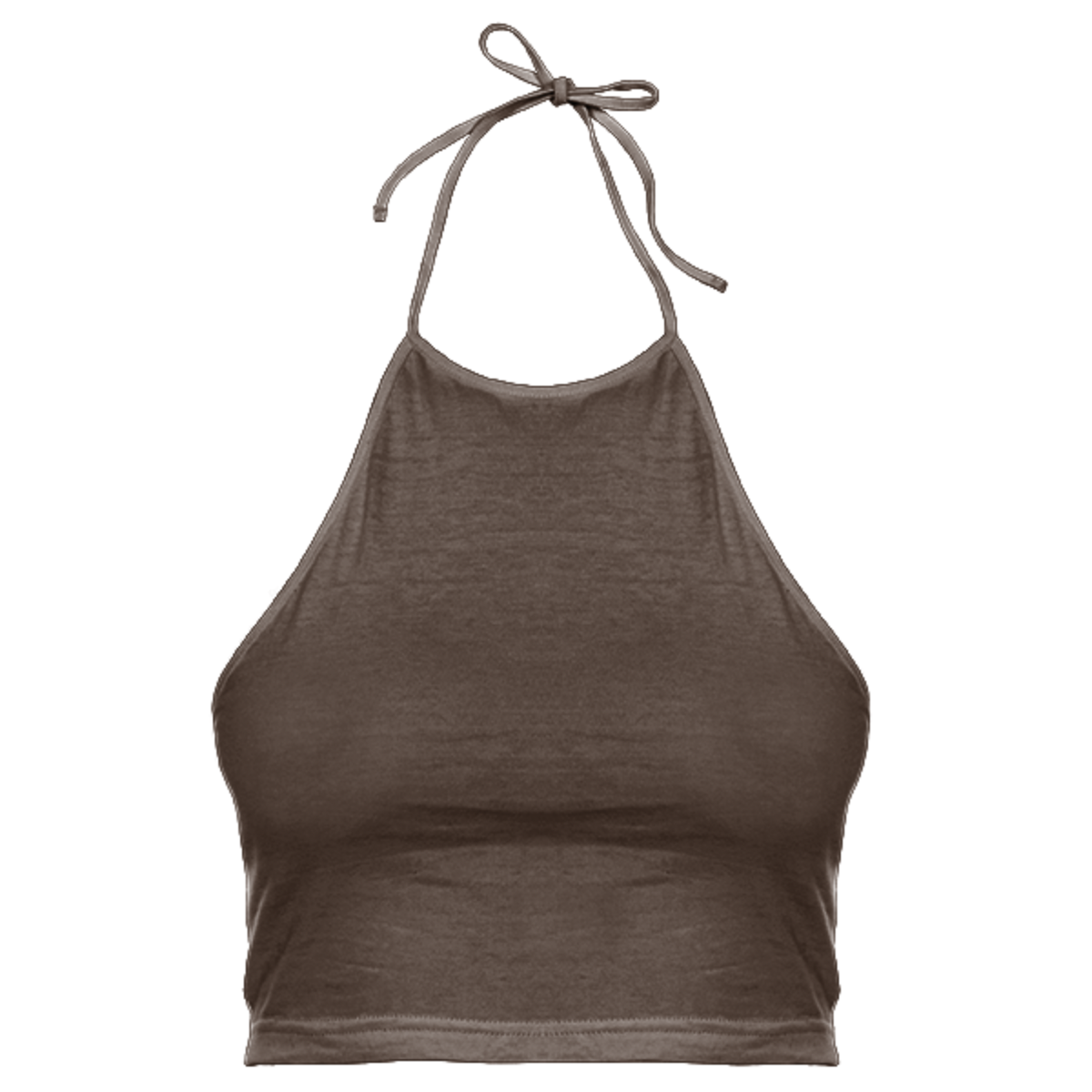 High neck halter top with adjustable ties. The back falls at the mid back and crops above the waist.