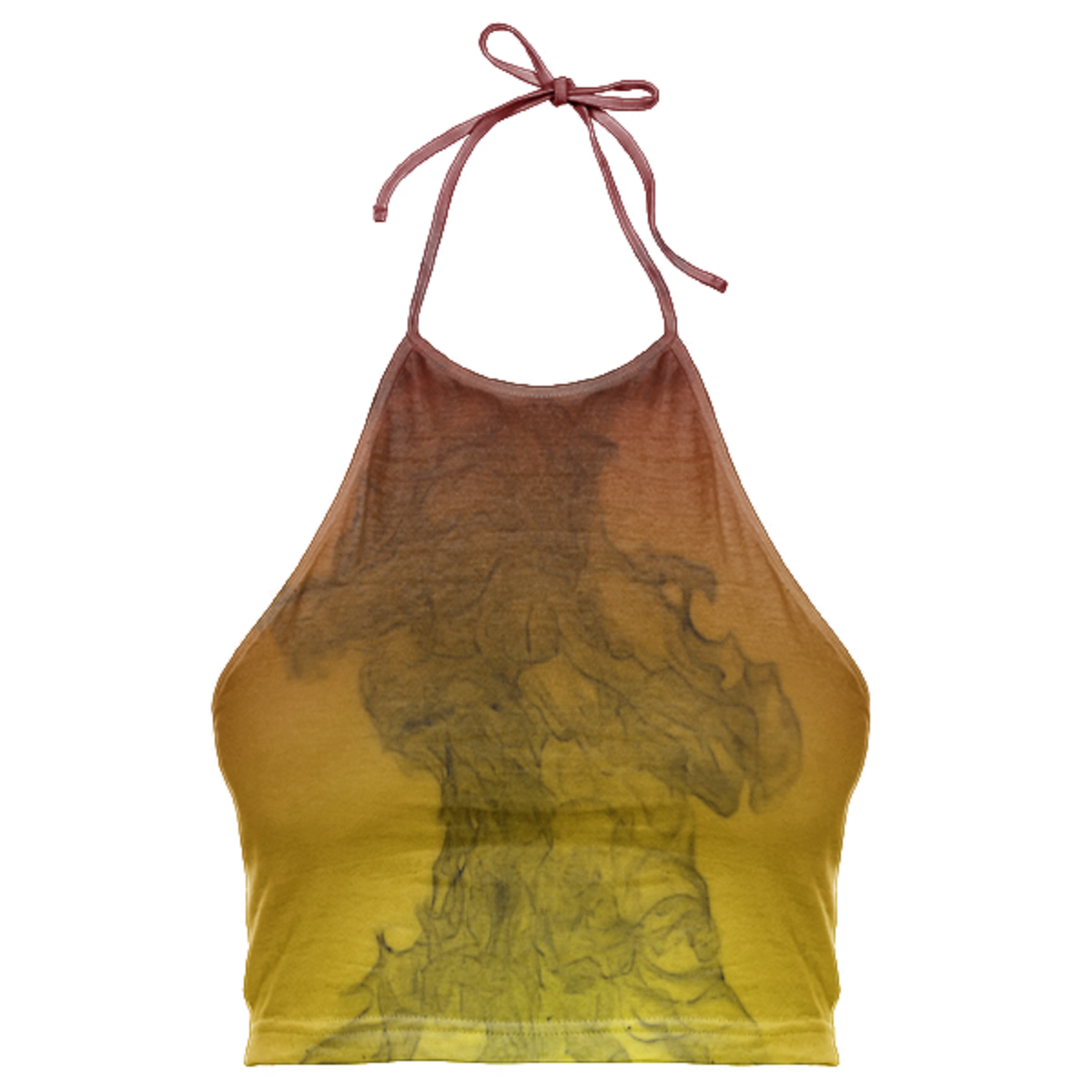 High neck halter top with adjustable ties. The back falls at the mid back and crops above the waist.