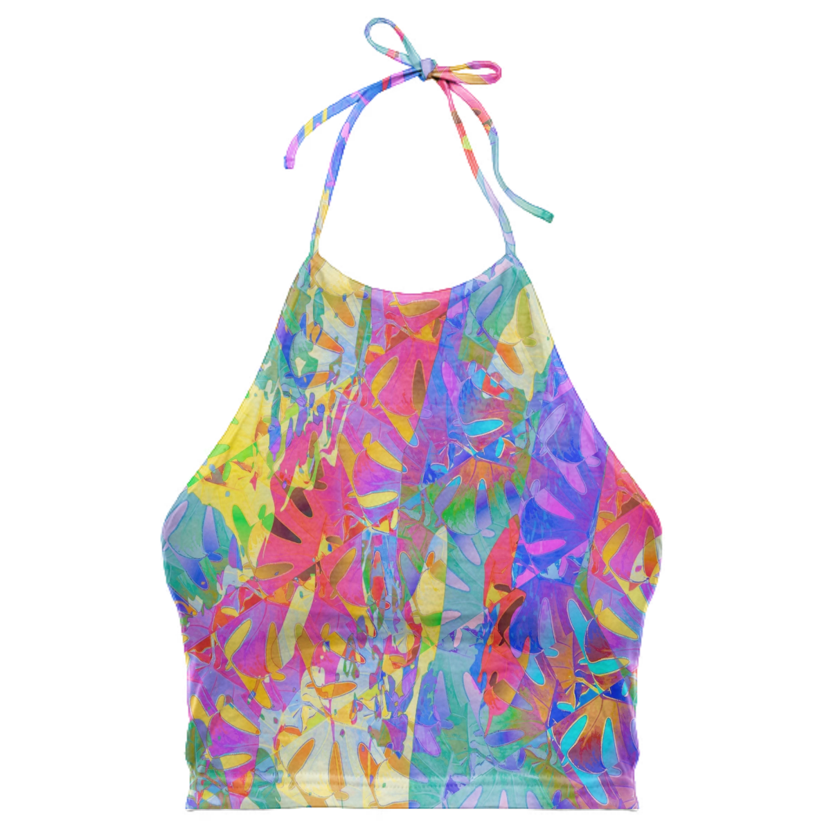 High neck halter top with adjustable ties. The back falls at the mid back and crops above the waist.