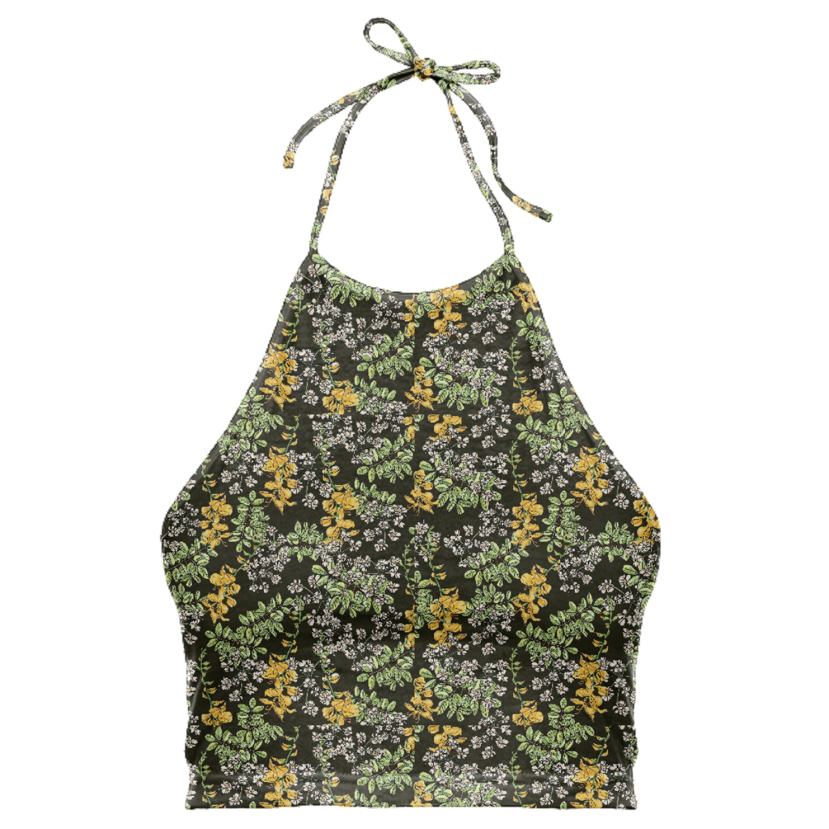 High neck halter top with adjustable ties. The back falls at the mid back and crops above the waist.