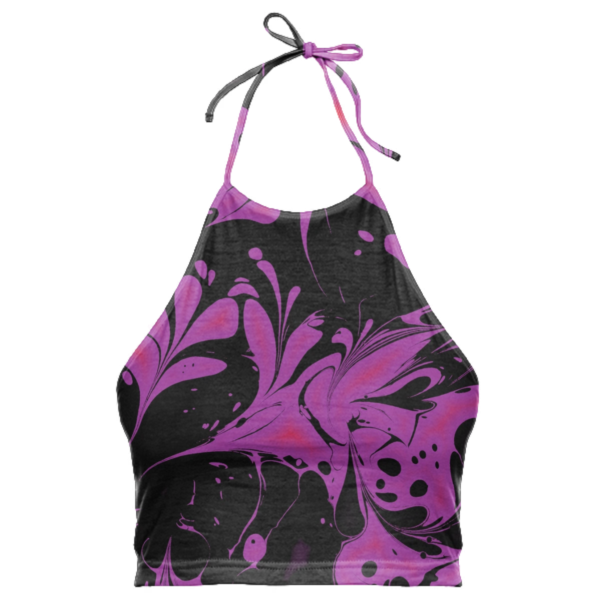 High neck halter top with adjustable ties. The back falls at the mid back and crops above the waist.