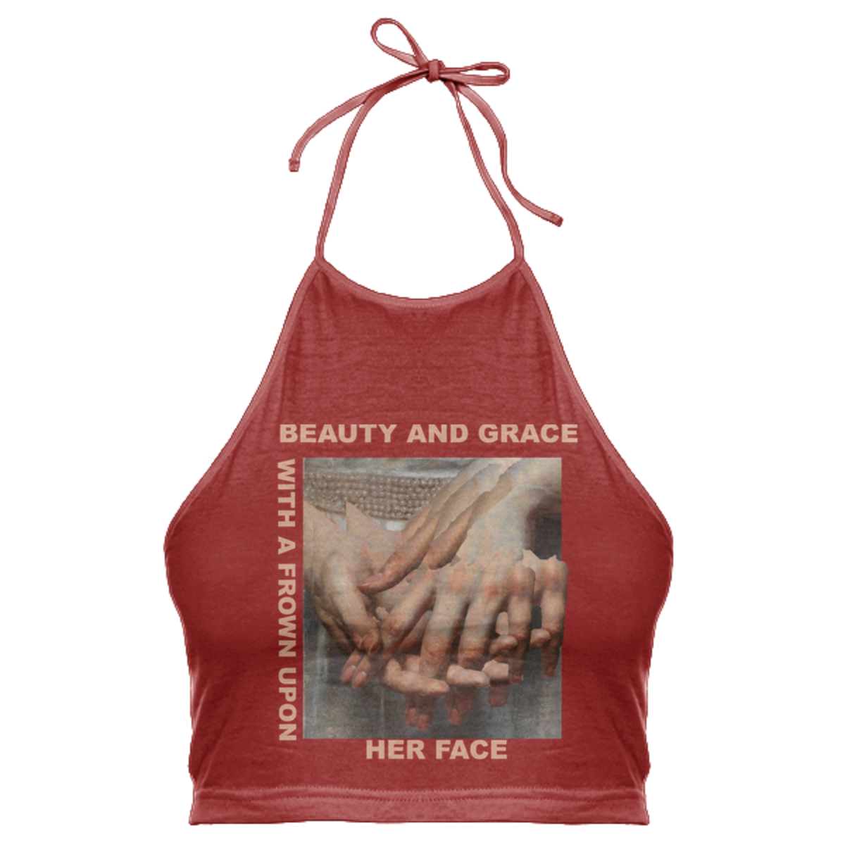 High neck halter top with adjustable ties. The back falls at the mid back and crops above the waist.