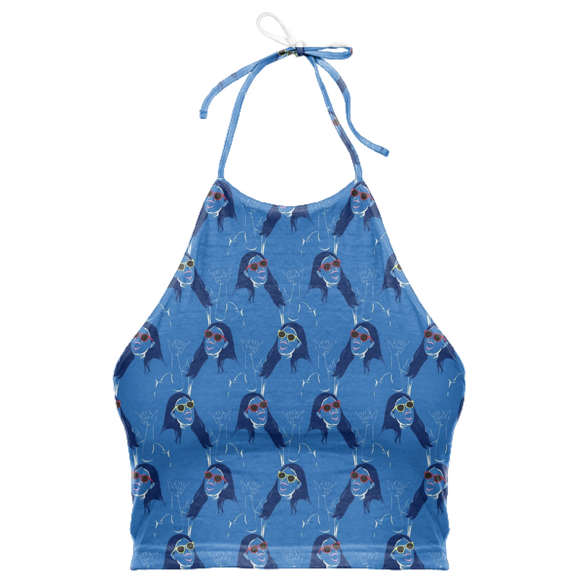 High neck halter top with adjustable ties. The back falls at the mid back and crops above the waist.