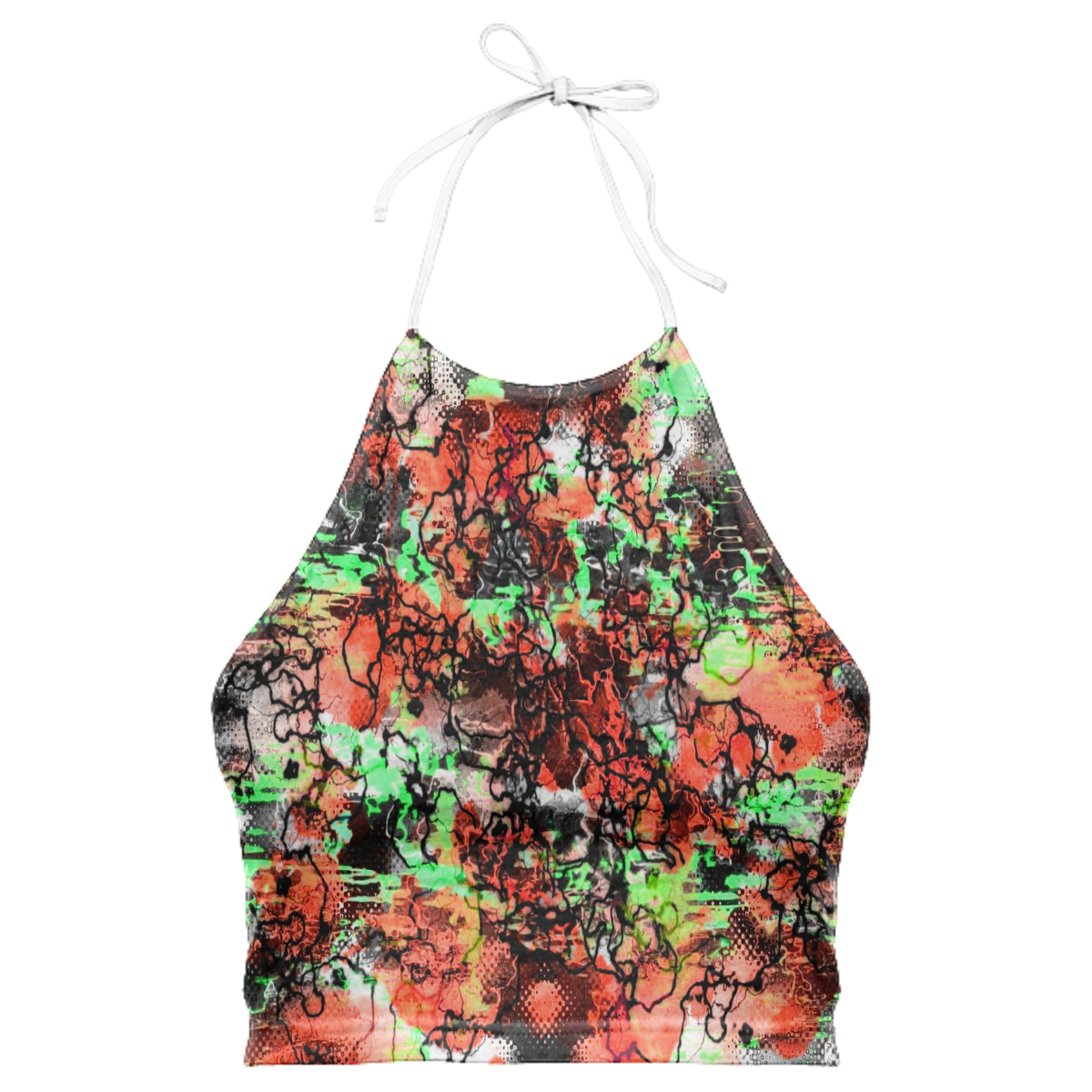 High neck halter top with adjustable ties. The back falls at the mid back and crops above the waist.