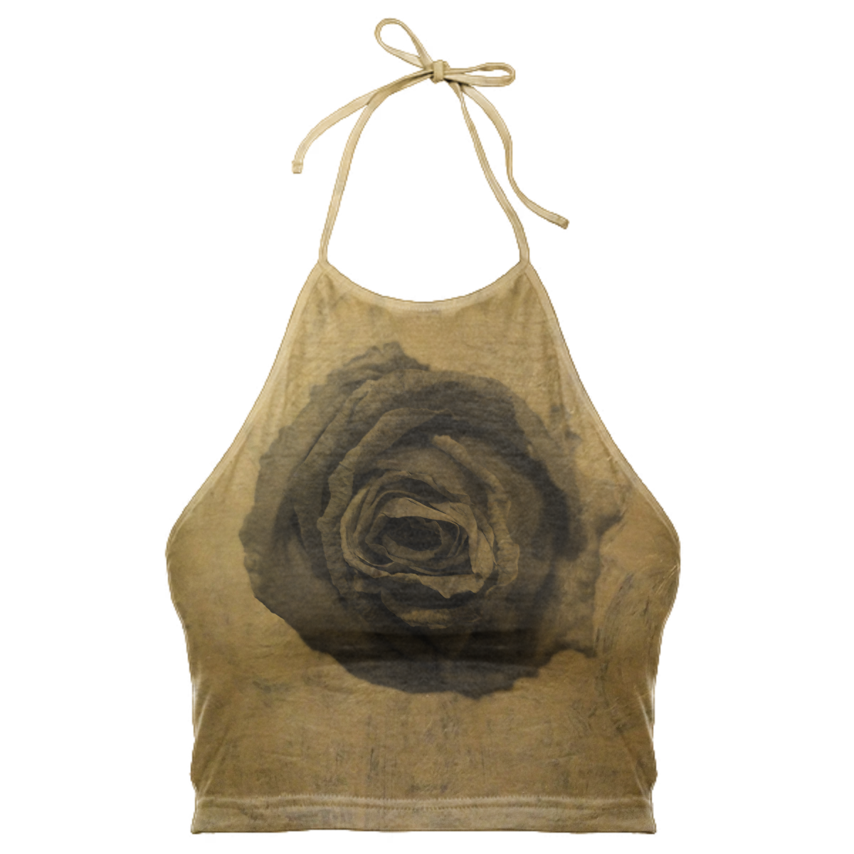 High neck halter top with adjustable ties. The back falls at the mid back and crops above the waist.