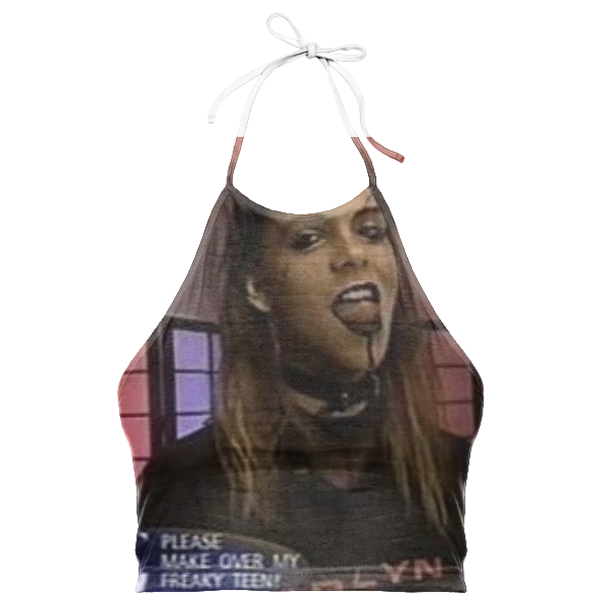 High neck halter top with adjustable ties. The back falls at the mid back and crops above the waist.