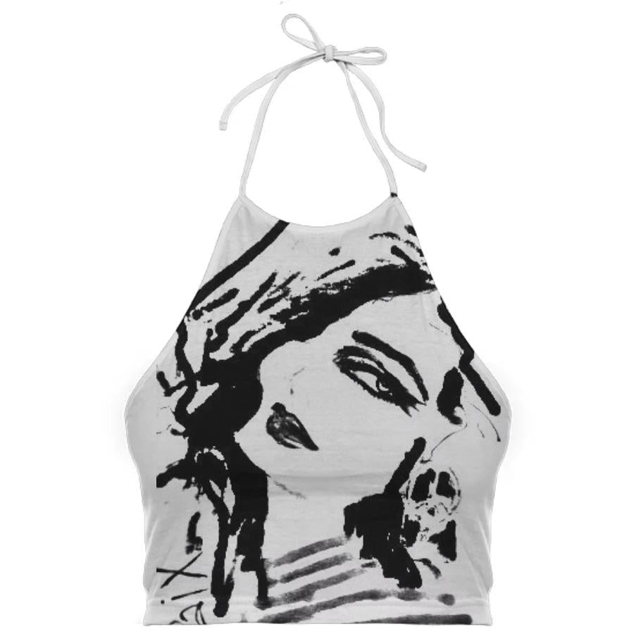 High neck halter top with adjustable ties. The back falls at the mid back and crops above the waist.