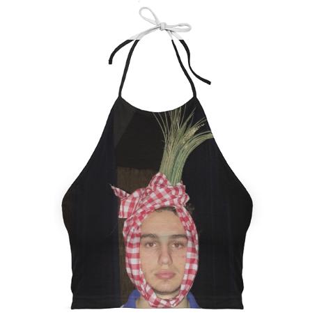 High neck halter top with adjustable ties. The back falls at the mid back and crops above the waist.