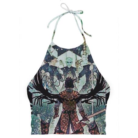 High neck halter top with adjustable ties. The back falls at the mid back and crops above the waist.
