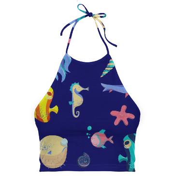 High neck halter top with adjustable ties. The back falls at the mid back and crops above the waist.