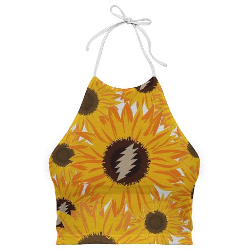 High neck halter top with adjustable ties. The back falls at the mid back and crops above the waist.