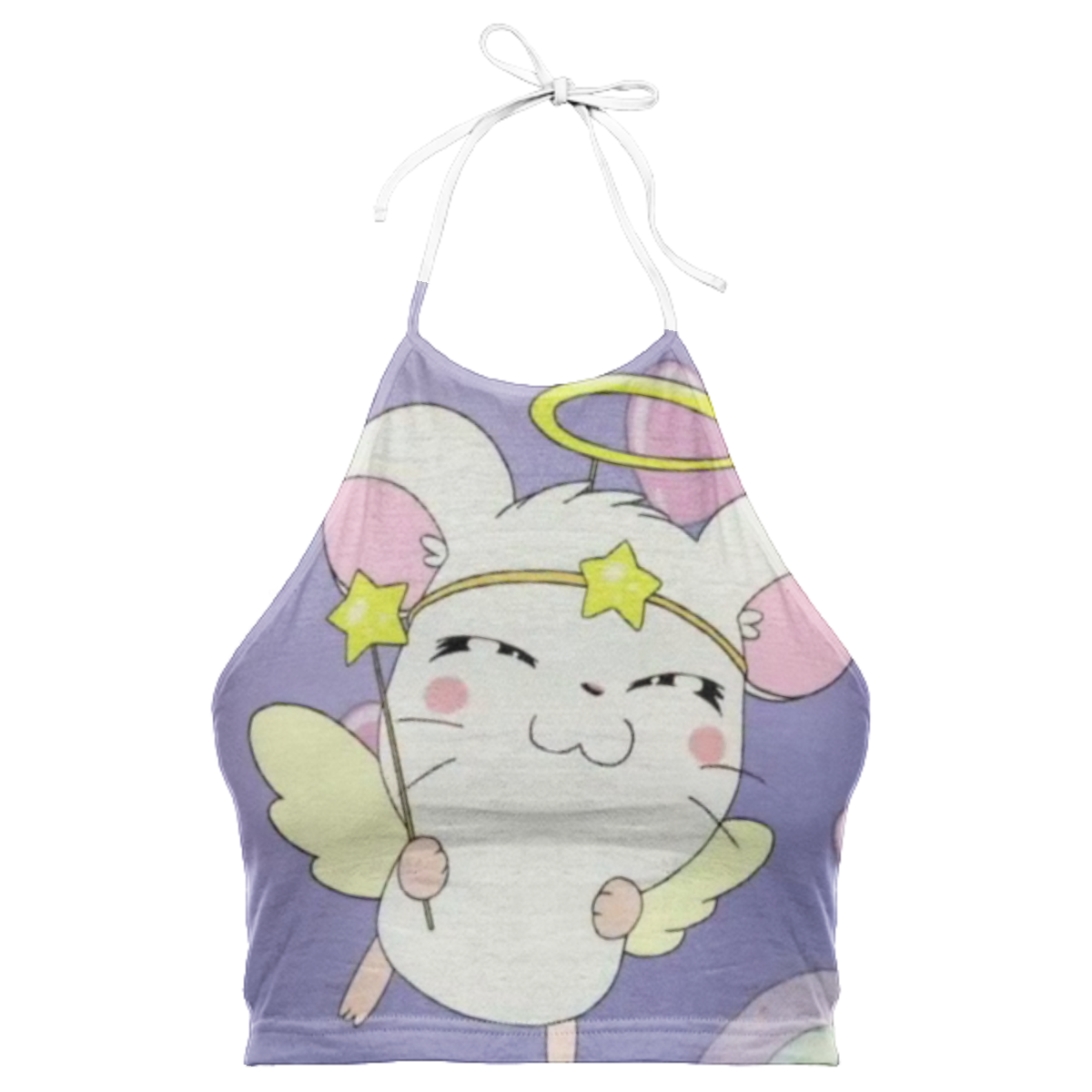 High neck halter top with adjustable ties. The back falls at the mid back and crops above the waist.