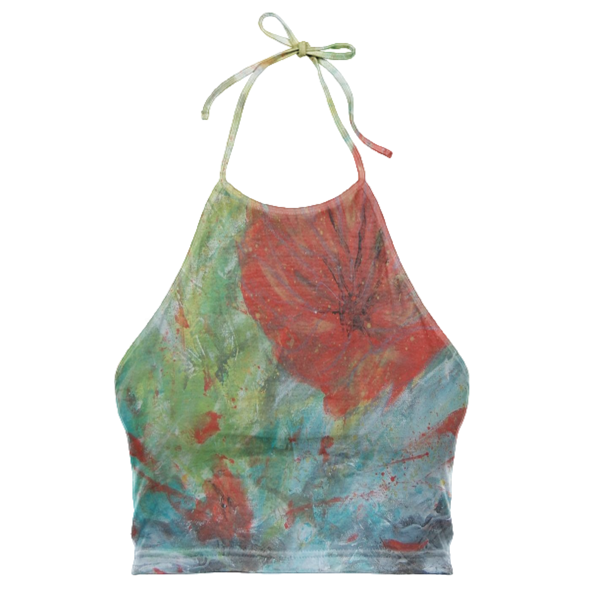 High neck halter top with adjustable ties. The back falls at the mid back and crops above the waist.