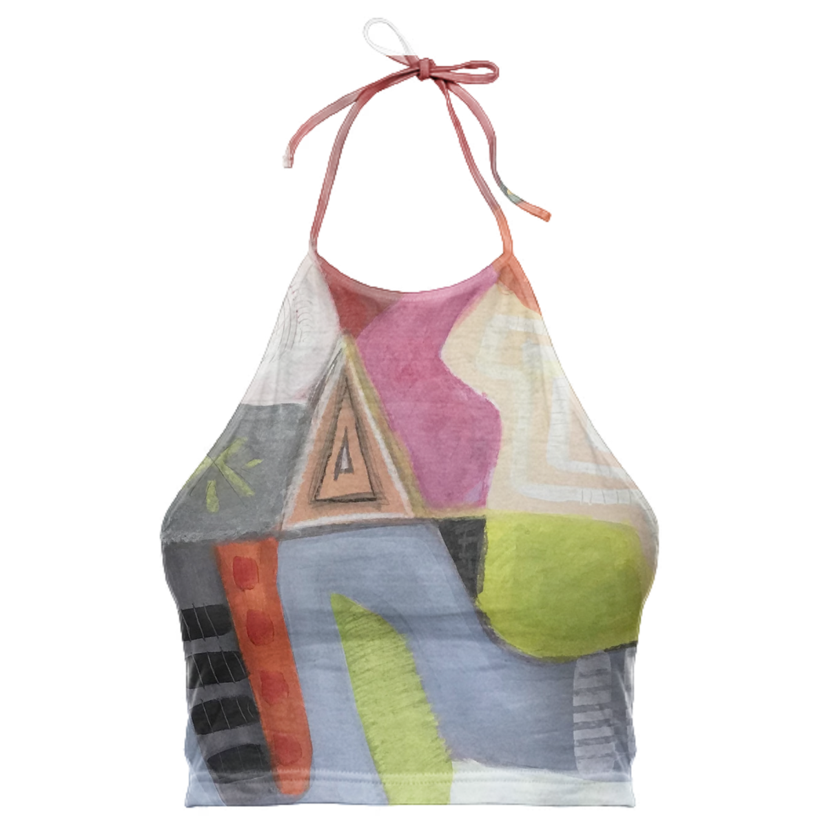 High neck halter top with adjustable ties. The back falls at the mid back and crops above the waist.