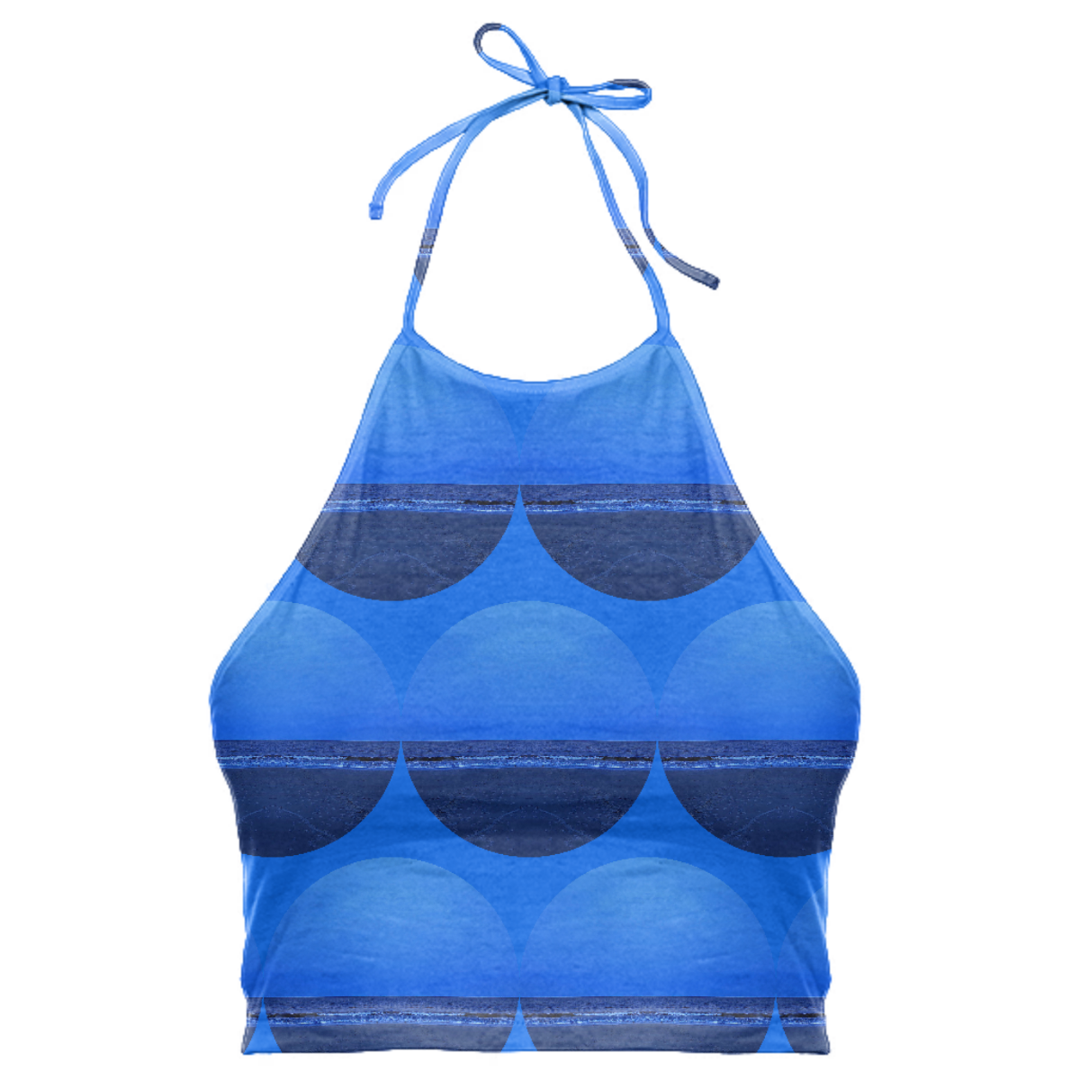 High neck halter top with adjustable ties. The back falls at the mid back and crops above the waist.