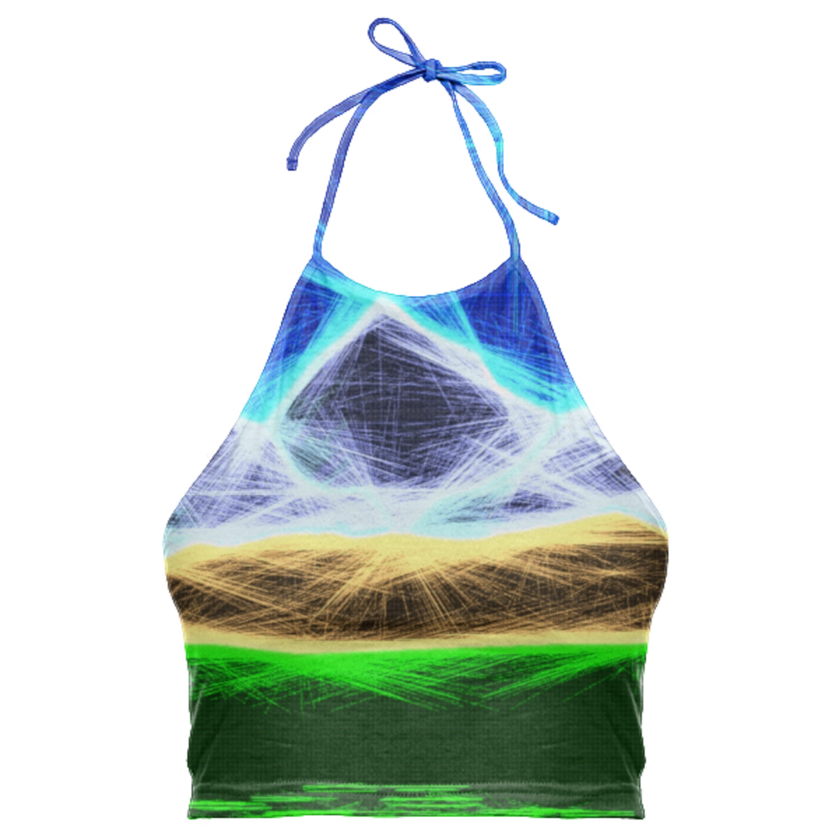High neck halter top with adjustable ties. The back falls at the mid back and crops above the waist.