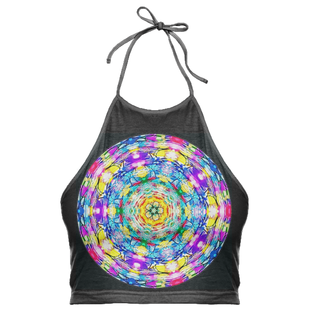 High neck halter top with adjustable ties. The back falls at the mid back and crops above the waist.