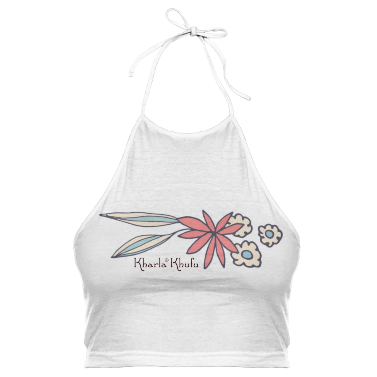 High neck halter top with adjustable ties. The back falls at the mid back and crops above the waist.
