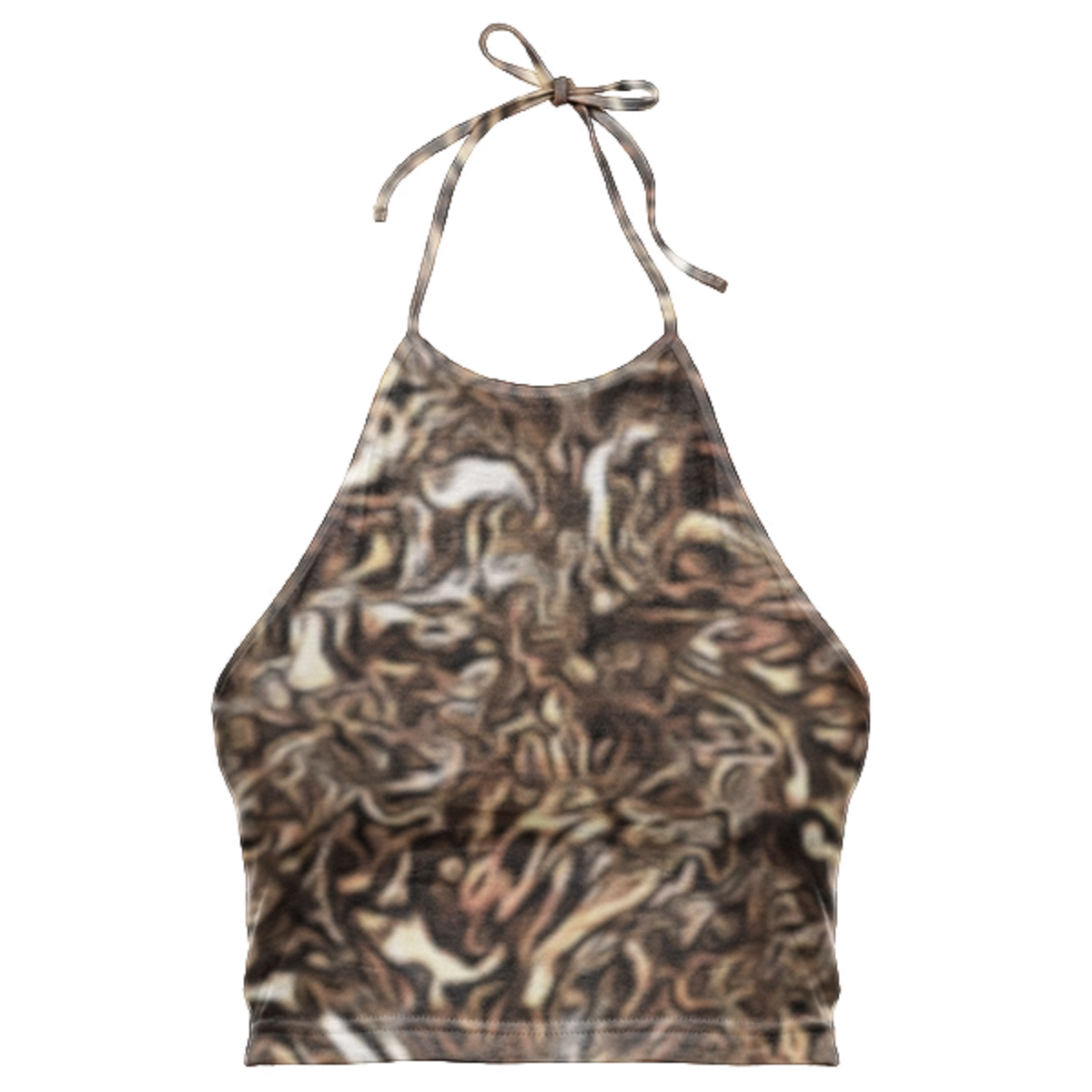 High neck halter top with adjustable ties. The back falls at the mid back and crops above the waist.