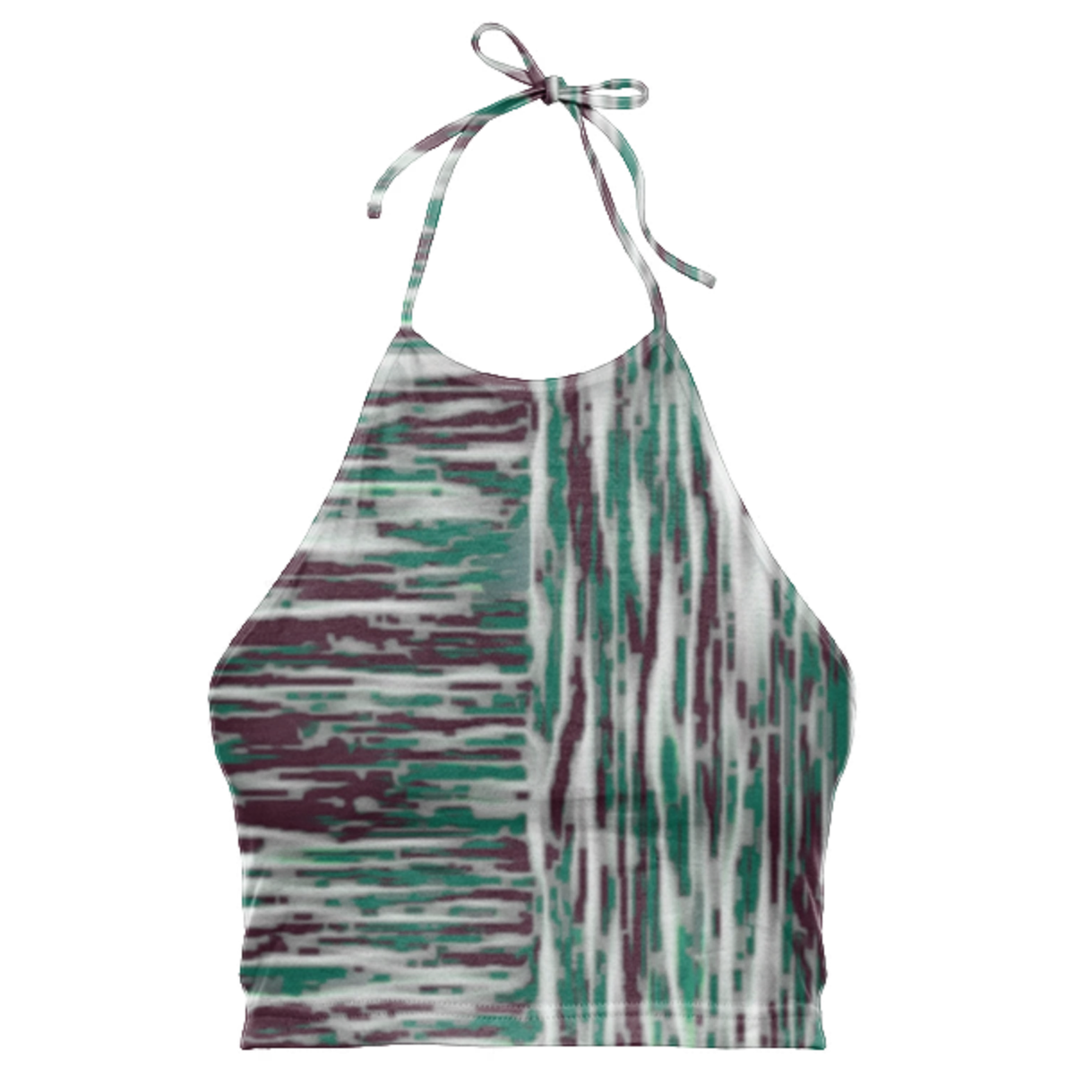 High neck halter top with adjustable ties. The back falls at the mid back and crops above the waist.