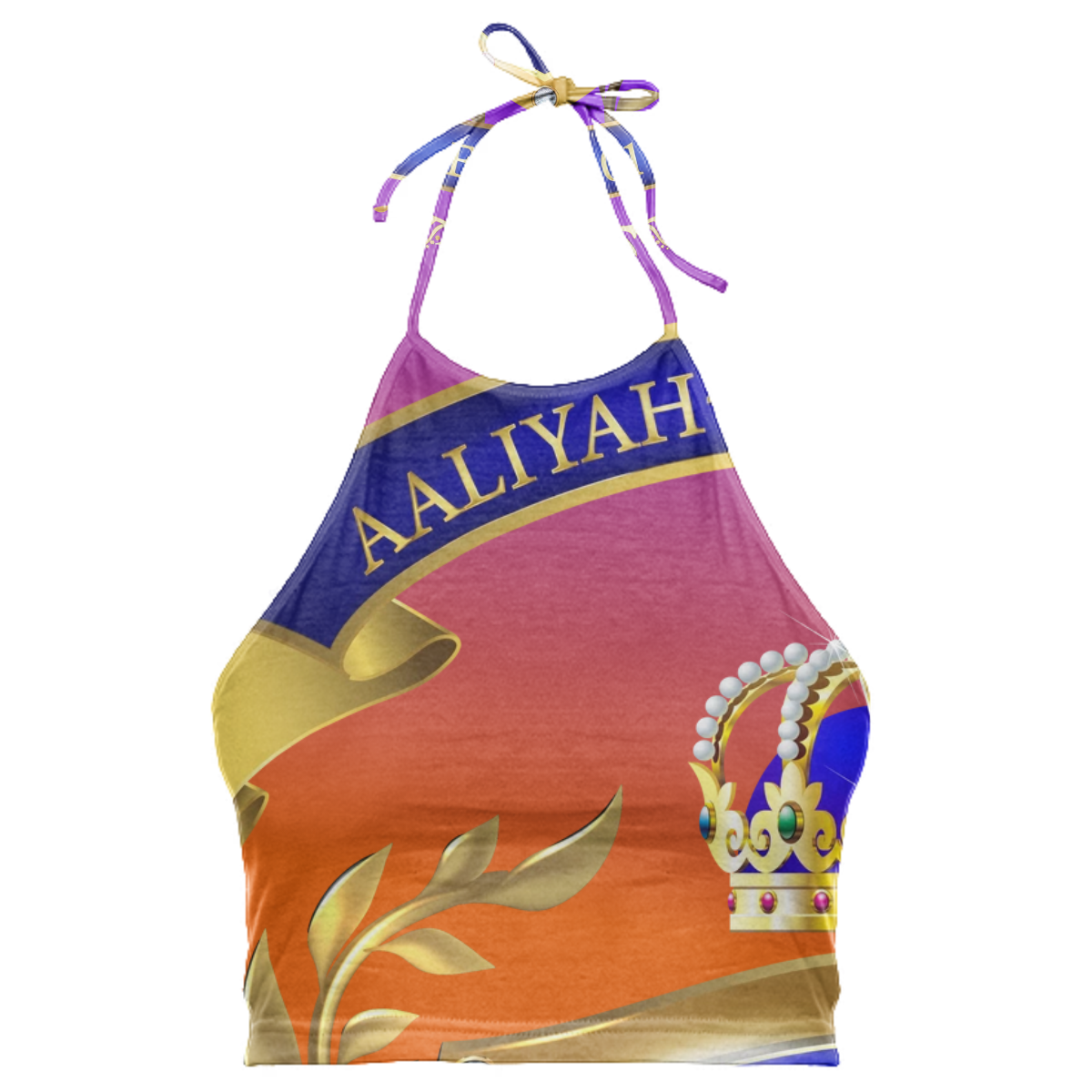 High neck halter top with adjustable ties. The back falls at the mid back and crops above the waist.