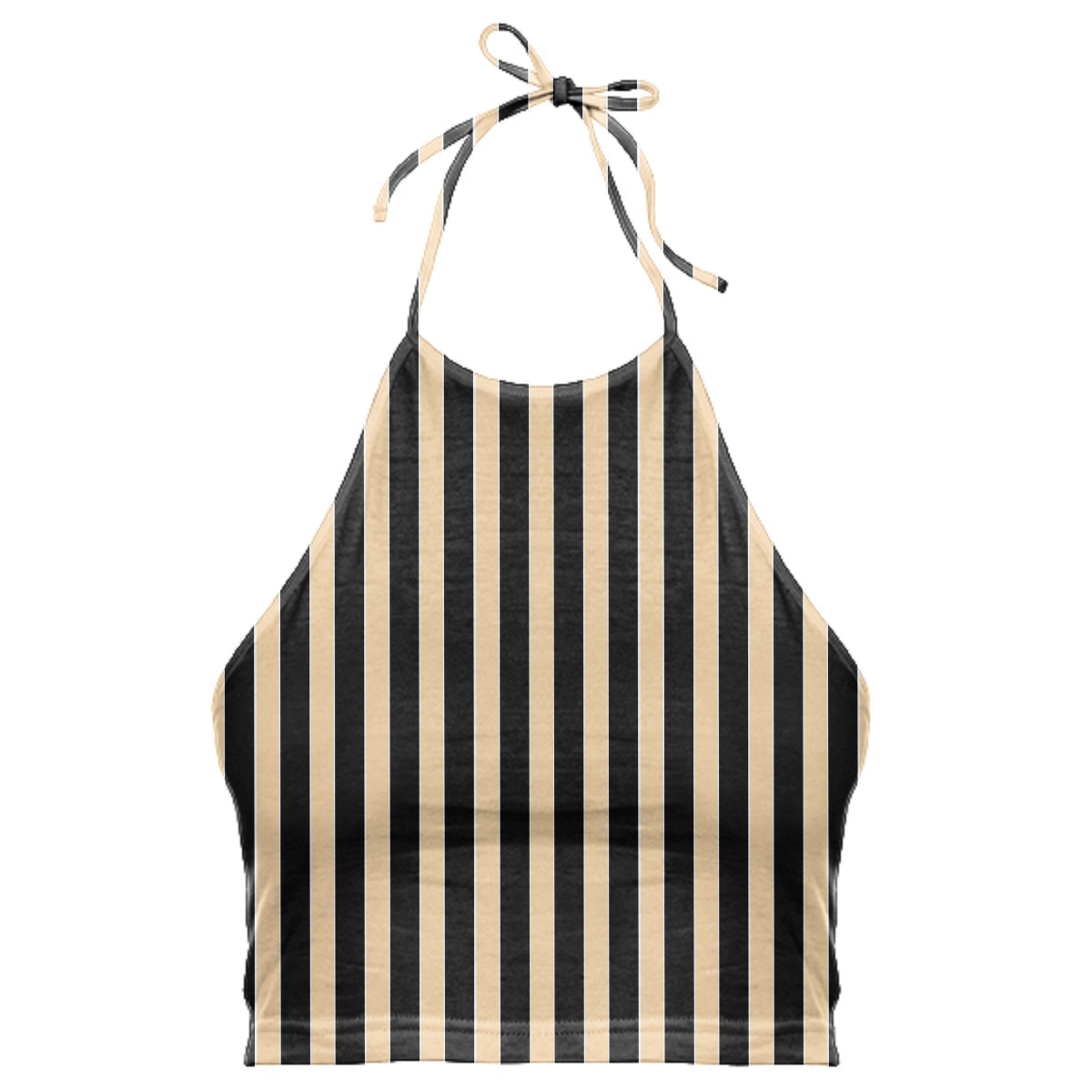 High neck halter top with adjustable ties. The back falls at the mid back and crops above the waist.
