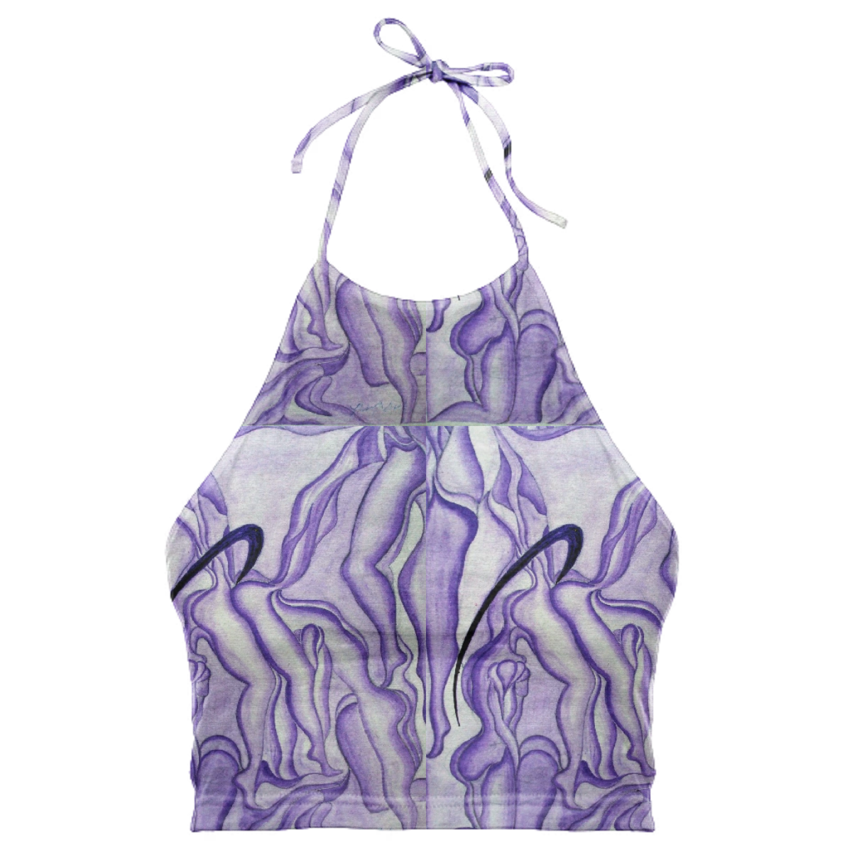 High neck halter top with adjustable ties. The back falls at the mid back and crops above the waist.