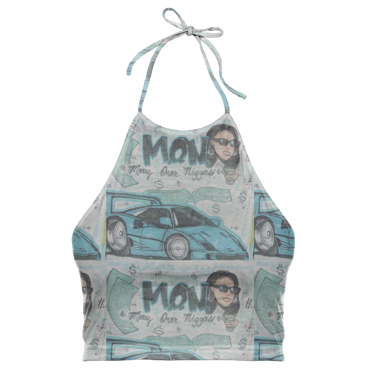 High neck halter top with adjustable ties. The back falls at the mid back and crops above the waist.