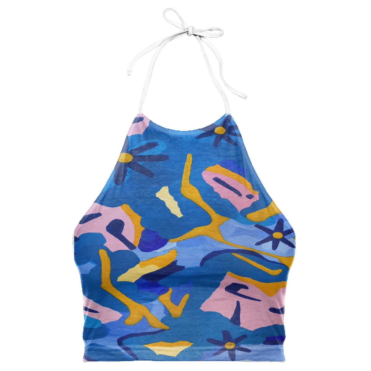 High neck halter top with adjustable ties. The back falls at the mid back and crops above the waist.