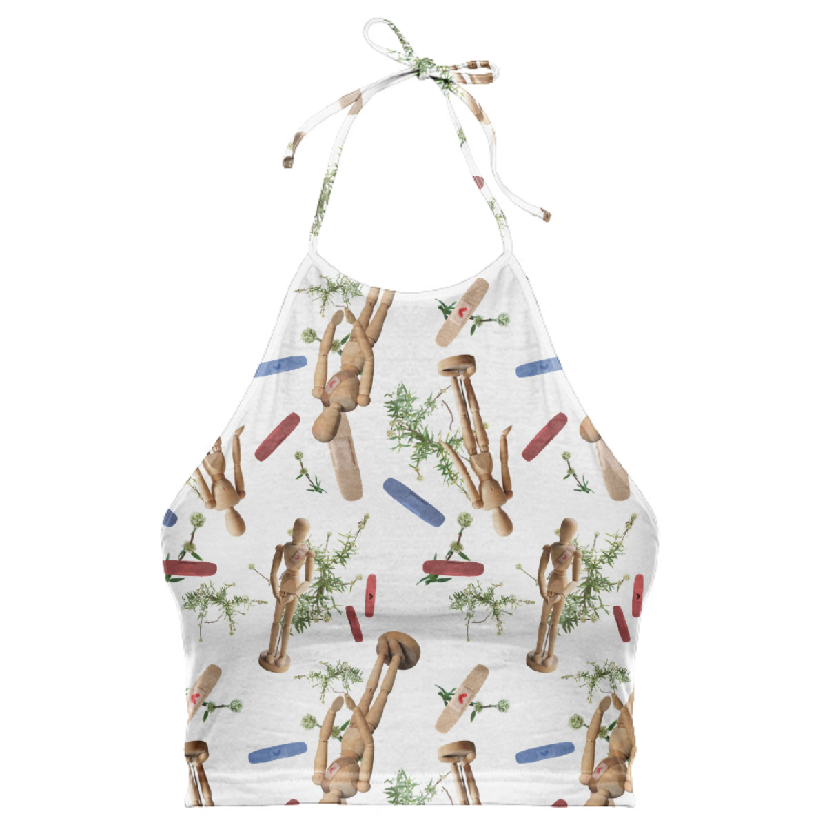 High neck halter top with adjustable ties. The back falls at the mid back and crops above the waist.