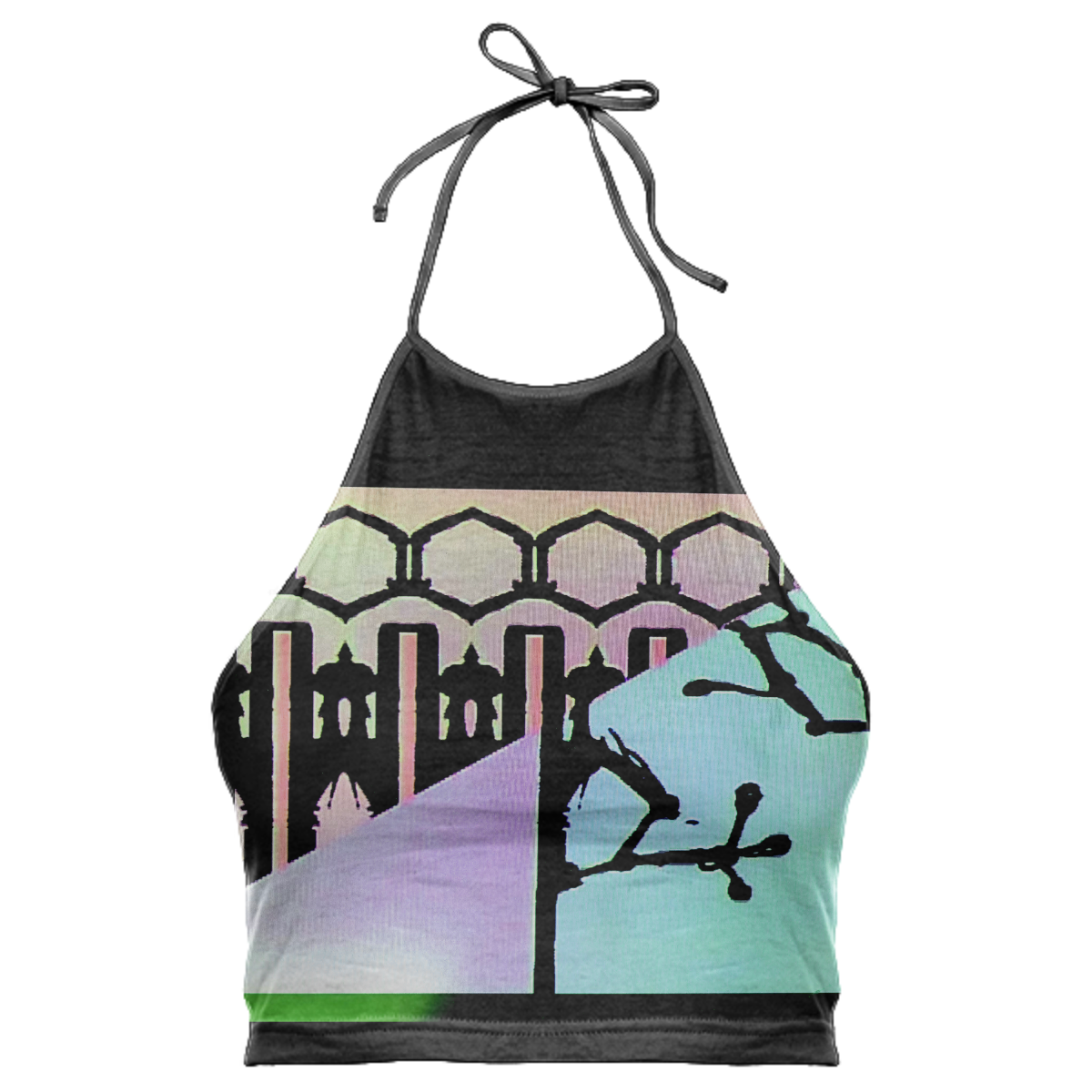 High neck halter top with adjustable ties. The back falls at the mid back and crops above the waist.