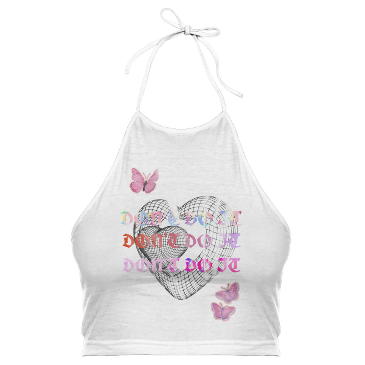 High neck halter top with adjustable ties. The back falls at the mid back and crops above the waist.