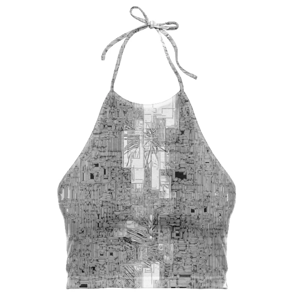 High neck halter top with adjustable ties. The back falls at the mid back and crops above the waist.