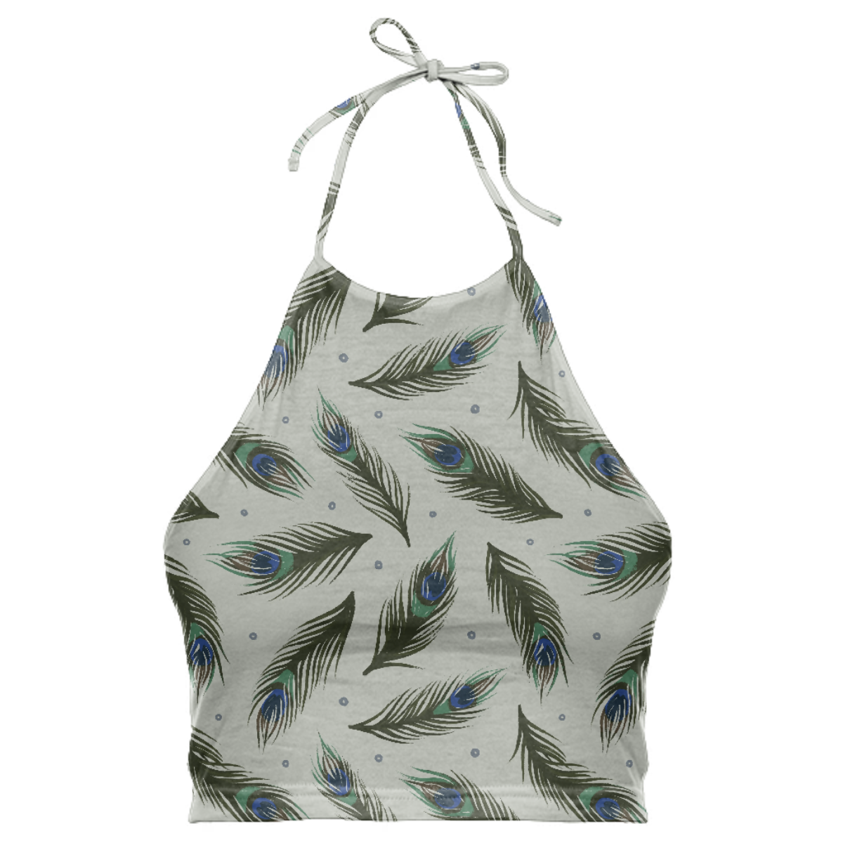 High neck halter top with adjustable ties. The back falls at the mid back and crops above the waist.