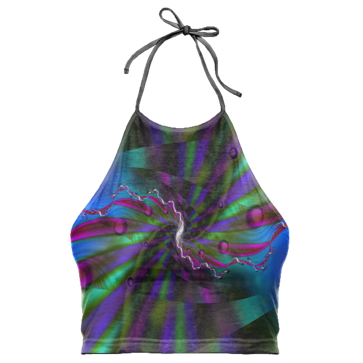 High neck halter top with adjustable ties. The back falls at the mid back and crops above the waist.