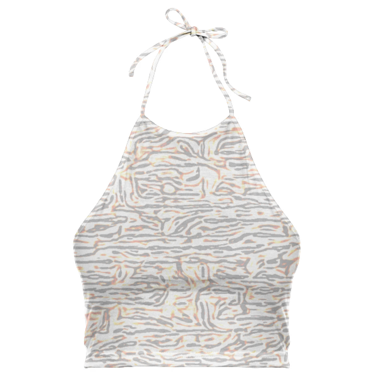 High neck halter top with adjustable ties. The back falls at the mid back and crops above the waist.